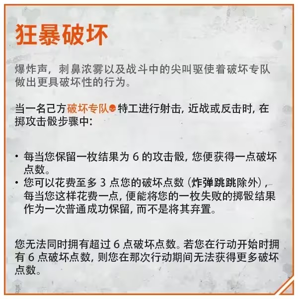 隨著戰鬥的喧囂越發強烈,破壞專隊的攻擊性也會隨之提高,他們會移動得更快,戰鬥得更激烈。他們的狂暴破壞陣營技能會依賴於他們的關鍵成功,將失誤轉化為命中,確保即使是瞄準度最差的火箭發射器也能精准找到自己的目標。