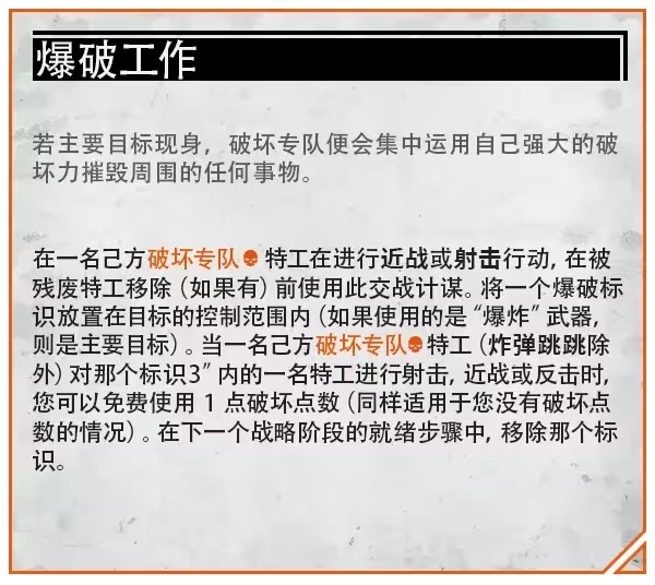 他們的戰略和交戰計謀同樣非常直接、簡單、有效,為破壞專隊提供了各種進攻和防禦的優勢。然而,他們並非完全沒有狡猾的特性,為爆破工作指定一個目標可以讓所有特工在攻擊目標附近任何東西時都可以免費使用破壞點數。
