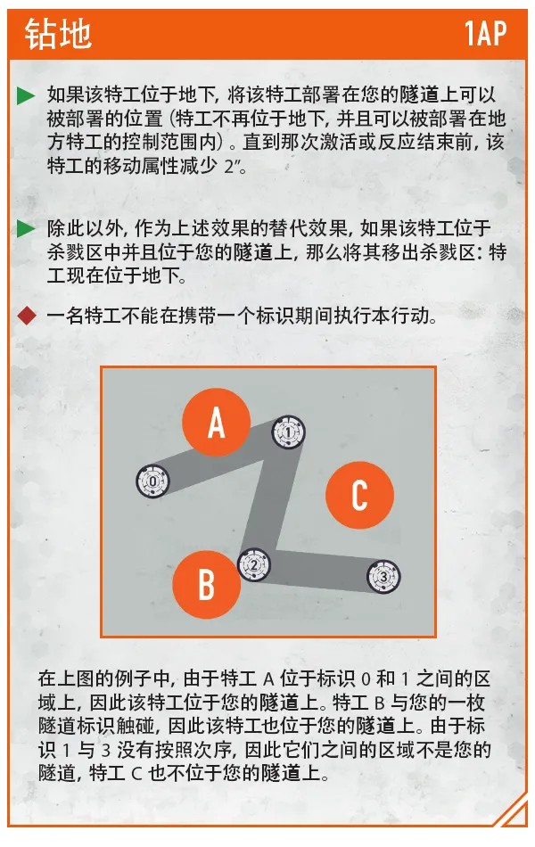 隧道是你在戰場上開闢的一條路徑。在每個轉捩點中,隧道可以延伸至多5英吋,這意味著它能夠輕鬆深入戰場。鑽地是讓小隊進出隧道的獨特行動,這會消耗2英吋的移動屬性和1 AP,但這對於一直擁有著3 APL和7英吋移動屬性的小隊而言,是一種非常值得的交易。