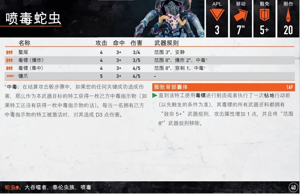 儘管所有的蛇蟲都具有著非常強大的能力,但噴毒蛇蟲是這支殺戮小隊中最為重要的角色之一。除了強大的近戰輸出以外,它的遠端攻擊也具有著絕對的殺傷力。結合膨脹背部囊體的技能,使毒鏢成為了遊戲中最優秀的全能武器之一。由於小隊中的其他成員的遠端攻擊範圍僅限於6英吋和4點的傷害屬性,噴毒蛇蟲將成為控制戰場的重要角色。