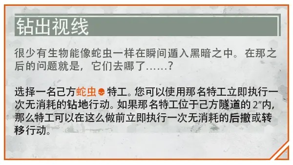 掠食本能將所有的這些能力整合在了一起。除了讓蛇蟲在每次啟動時能夠進行兩次近戰行動外,還允許它們在進行反應時,免費更改命令並執行鑽地行動。試想一下,一隻蛇蟲衝鋒9英吋,纏住幾個特工,然後在近戰中消滅他們,在一次射擊反擊中存活下來,然後再次回擊後並潛入地下。這可真是令人不寒而慄。