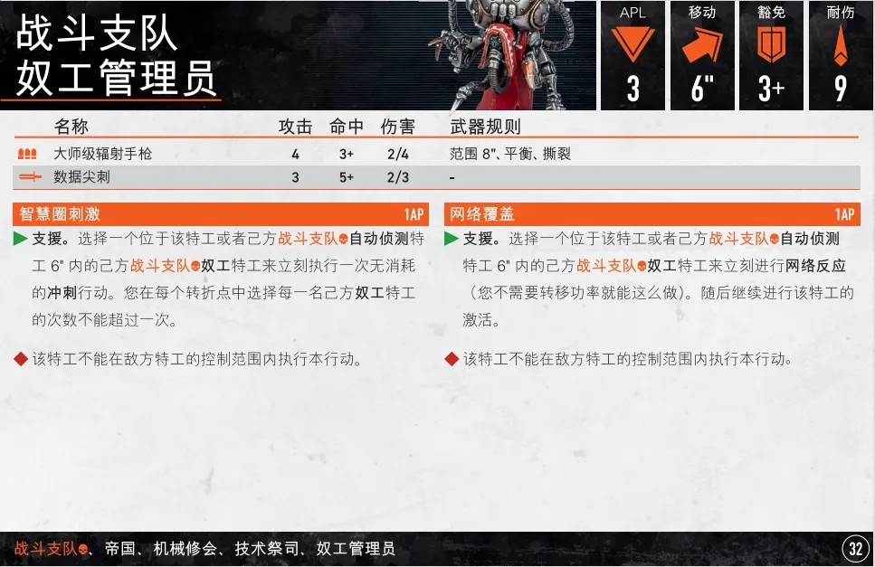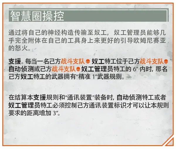在大多數遊戲中都可能會出現的全新計謀便是智慧圈操控。它為靠近奴工管理員和自動偵測奴工的特工提供了射擊加成,擁有精準1的武器規則。這支小隊最強武器的命中屬性為4+,因此,額外的精準會非常重要!由於還具有支援規則,通用裝備通訊裝置能將其範圍提升至9英吋,潛在地為小隊中的大部分成員提供增益效果。
