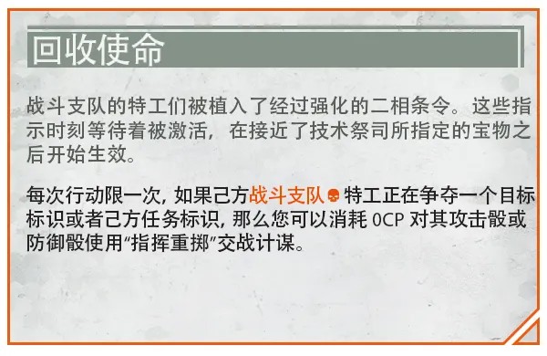 回收使命是一個很棒的計謀,可以幫助那些喜歡在指揮重擲上花費太多精力的玩家,而神經迴圈後備電源則是一個潛在的非常棒的陣營裝備,儘管依賴于對戰開始時的一枚D3擲骰,其固有的隨機性可能會使其效果變得極不穩定。但依靠著支援規則的數量,通訊裝置似乎是你能夠找到最接近必選的通用裝備了。