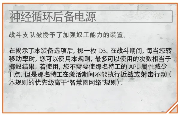 儘管戰鬥支隊只有著一個陣營規則,但智慧圈網路足以賦予這支小隊戰術優勢和獨一無二的身份。八位奴工各自都能夠花費1AP,讓另一位元奴工進行網路反應,無消耗執行一次消耗1AP的行動,不過有著一些限制條件。