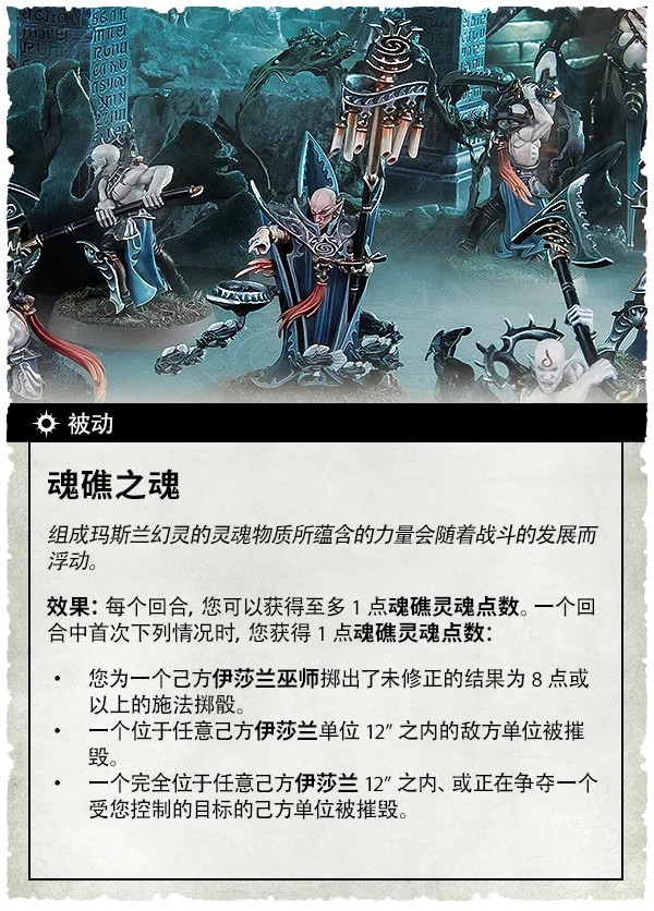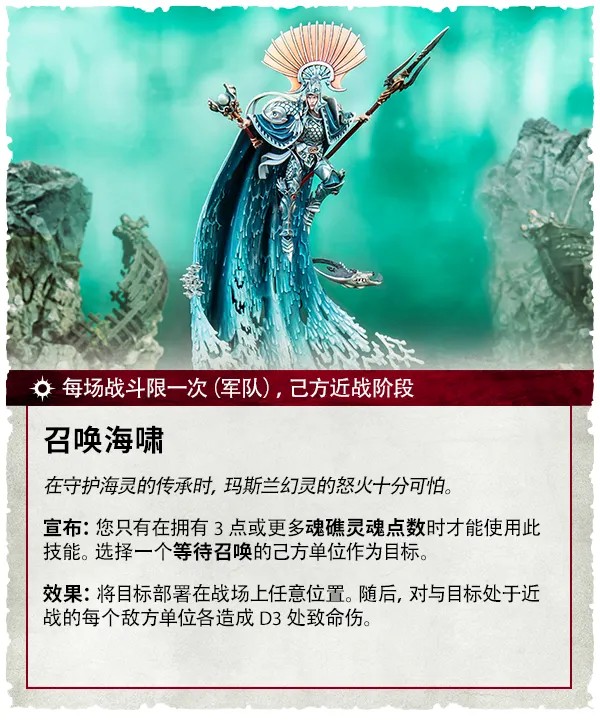 在這本規則書中,還包含了兩支全新的載譽軍隊,為你在戰場上的戰略提供了全新的選擇。其中一支,以沃爾圖諾斯,深海至高王為核心,他同樣也是艾恩瑞奇飛地的統治者。而另一支載譽軍隊,則以被召喚的幻靈及其守護魂礁的盟友為核心。