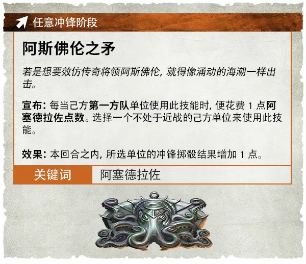 這些神秘的教導究竟是什麼?他並不會明確告知你,但在你的每個英雄階段,你都會獲得D3點阿塞德拉佐點數,這些點數可以用於三種技能之一。烏爾吉斯之盾允許第一方隊的一個單位後撤且免受傷害,同時仍然能在後撤之後進行射擊和衝鋒,這與阿斯佛倫之矛有著很好的搭配,後者能為衝鋒擲骰結果增加1點。格維納之劍能夠賦予一個單位先攻,使你的皇家護衛能夠跟上沃爾圖諾斯閃電般的快速突襲。