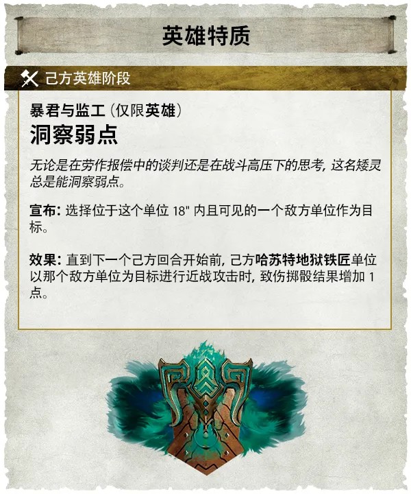 洞察弱點可指定一個18英吋內可見的敵方單位,對其進行近戰攻擊時,致傷擲骰結果增加1點。這能讓你的半牛人的致傷擲骰達到2+,煉獄步兵的致傷擲骰達到3+。
