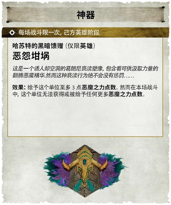 惡怨坩堝,在每場戰鬥中限用一次,可以立即讓攜帶者獲得3點DPP。把它交給你的惡魔鐵匠,啟動後還能為附近一台友軍戰爭機器增加足足18英吋的射程。此組合能讓死亡嘯叫者火箭炮的射程暴增至42英吋,並具備強大的反制凶獸的威力。