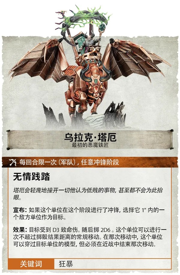 烏拉克.塔厄是統禦札爾頓軍隊的絕佳統帥。他擁有著穩健的遠端攻擊,並且還能夠發動近戰射擊,而他危險的近戰武器在衝鋒後+1傷害,極具威脅。作為巫師(2),他還能夠在敵方英雄階段自由調配全軍的DPP。你可以先給戰爭機器灌注火力打出毀滅性的射擊,隨後再給煉獄步兵提升防禦力。憑藉無情踐踏,他能夠在衝鋒時造成D3致命傷,並額外移動2D6英吋,輕鬆越過各種障礙,直取高價值目標。