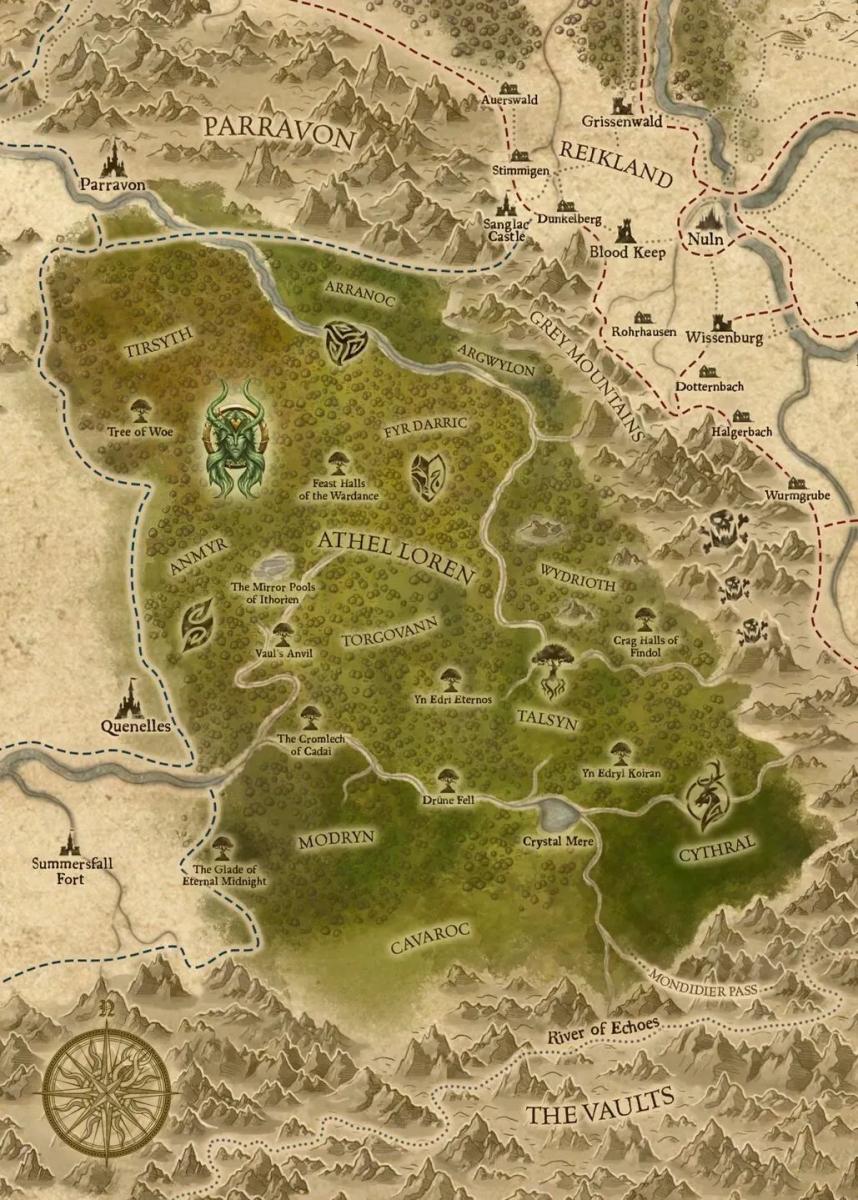 在奧蘇安精靈最輝煌的時代,他們的殖民地和前哨站遍佈這個世界已知的每個角落。但這輝煌並未長久。瑪勒瑞昂的背叛將精靈的祖先之地捲入怒火和戰爭。精靈們別無選擇,只能放棄許多遠方的領土,返回自己的家鄉。但並非所有居住在舊世界的精靈都願意放棄那裡。在留下的精靈當中,最值得注意的是住在艾索洛倫森林附近的精靈們。他們斷絕了一切與鳳凰王之間的聯繫,自力更生,尋求獨立。艾索洛倫森林也由此成為了一個獨立的王國。