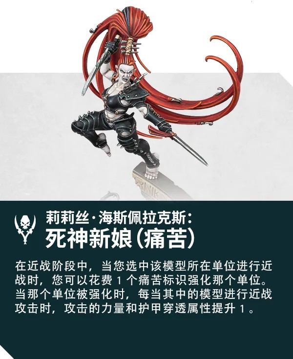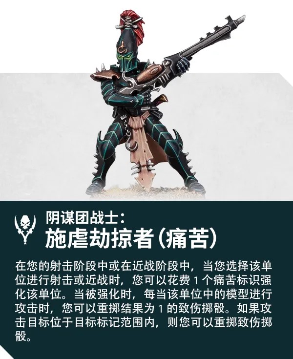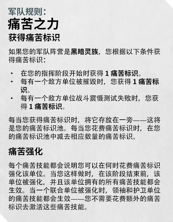 在戰場上,一旦黑暗靈族開始屠戮成群的弱小敵人,這種特性便會為他們帶來顯著的戰力提升,這一切都體現在全新升級的痛苦之力軍隊規則中。獲取關鍵的痛苦標識方式與以往類似,依舊依賴於持續摧毀敵方單位並使其陷入戰鬥震懾狀態,但不同的是,如今你不再將兩種通用技能之一賦予花費標識的單位,而是每個資料表都擁有其專屬的痛苦技能。