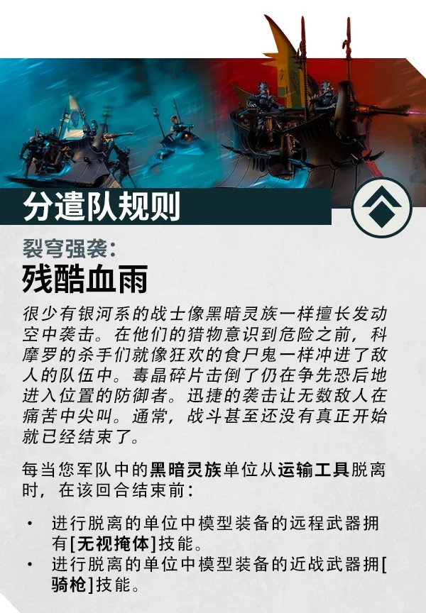 裂穹強襲沿襲了黑暗靈族經典的閃電突襲打法:部隊剛脫離艦船便獲得強化,傾瀉殘酷血雨般的火力。鑒於黑暗靈族的多數遠端武器已憑藉針對步兵等規則輕易造傷,本次分遣軍規則不再追求更高傷害,而是直接無視敵方掩體,令其失去寶貴的豁免,或在你跳離掠襲艇、沖入近戰的瞬間,進一步提升你的命中率。
