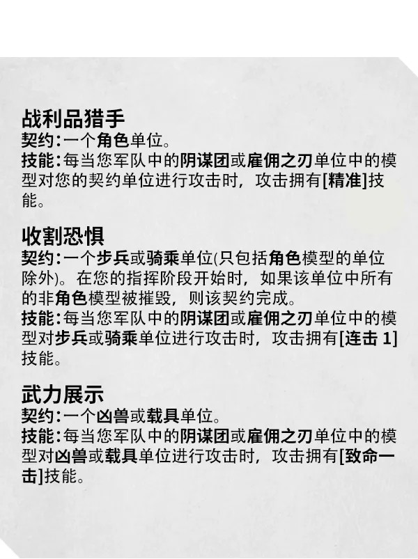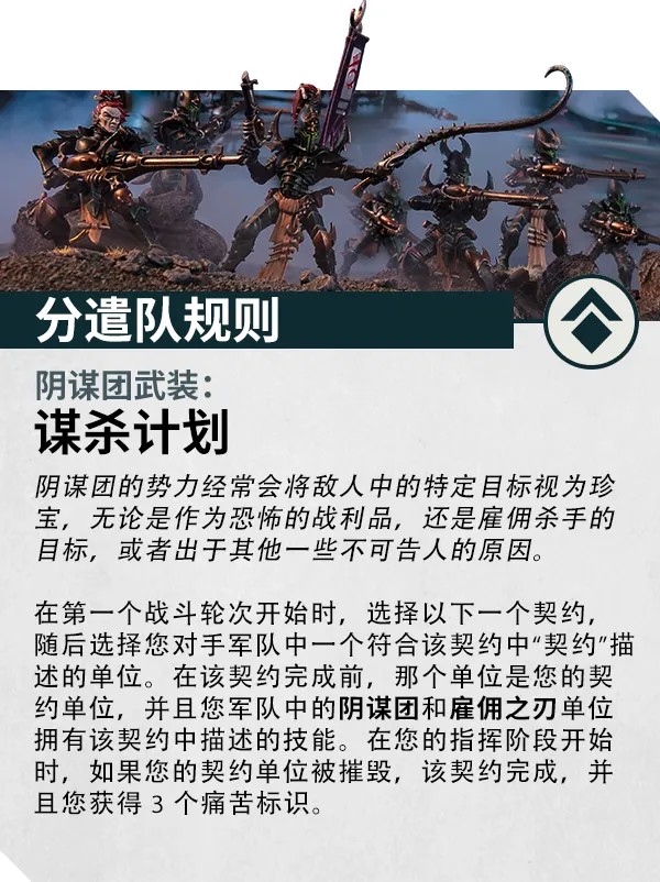 陰謀團武裝向來以雇傭殺手作風聞名,尤其擅長獵殺高價值目標。謀殺計畫規則讓你能夠為敵方單位掛上懸賞,集中全部火力將其殲滅,並在得手後收穫一大筆痛苦標識。