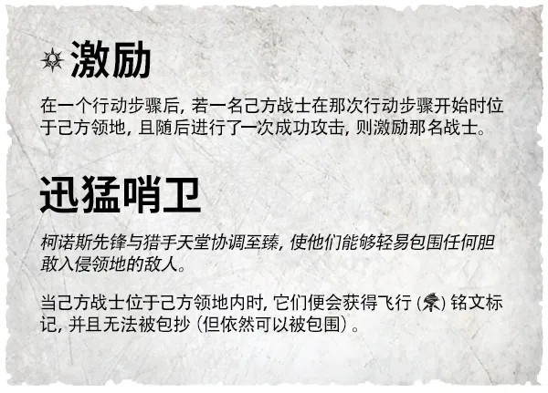 柯諾斯先鋒誓要窮盡一切手段將敵人逐出領地,與之相應,他們的激勵條件為:在友方領地開始行動步驟,並在此期間進行了成功攻擊。這讓你既能堅守家園,也能衝鋒陷陣、嚴懲入侵者。