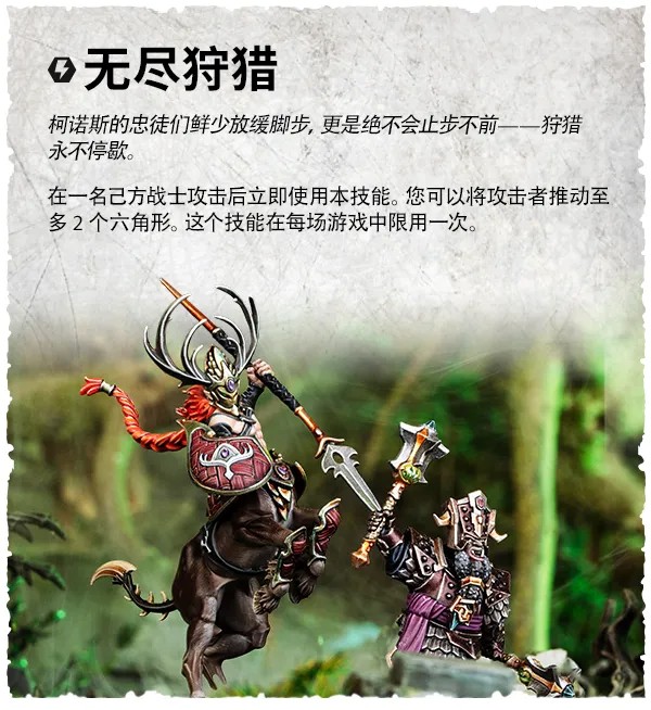 他們的高機動與致命性也延續到每場遊戲一次的專屬技能上。無盡狩獵是一項永無止境的使命,每場遊戲中,在友方戰士完成攻擊後,可將其再沿直線推進最多兩個六角形,既能銜接下一場戰鬥,也能脫離險境,或搶佔關鍵目標。