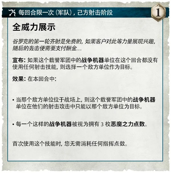 這股全威力展示在首次使用時免費,但之後每次動用都需支付1點指揮點數。代價雖在,卻物有所值:只要兩門戰爭機器鎖定同一目標,它們便可各視為擁有3點惡魔之力點數。