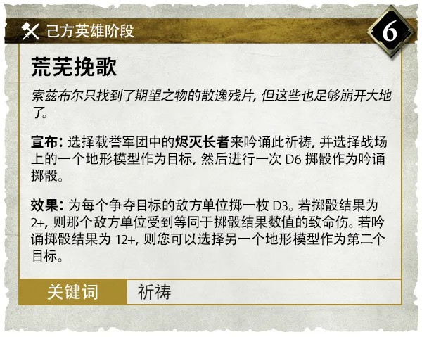 至今,索茲布林手中僅握有散逸殘片,但憑這些他便可吟誦強大的荒蕪挽歌,令那些愚蠢地依託地形掩蔽的敵人灰飛煙滅。當吟誦擲骰達到6+時,你可指定一處地形模型作為目標,為爭奪該目標的每個單位擲一次D3,若結果為2+則造成等同於擲骰結果數值的致命傷,若吟誦擲骰結果為12+,還可再選一處地形模型,禍及更廣。