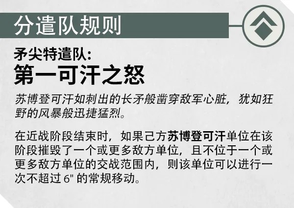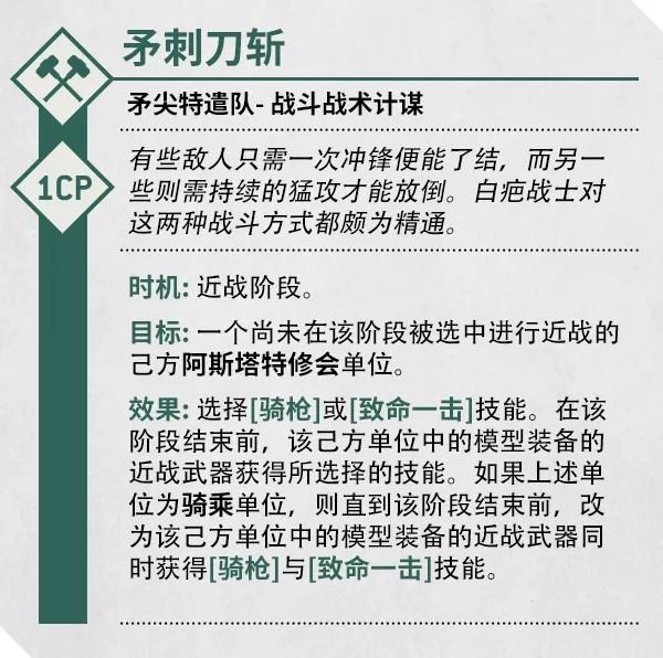 該分遣隊的強化與計謀同樣圍繞「高速近戰」展開,例如後撤重組,花費1CP,可讓一支部隊瞬間撤回戰略預備隊,眨眼間重新部署到戰場任何角落。而當他們全力衝鋒、準備收割時,又可發動矛刺刀斬,在近戰階段賦予目標單位一項自選增益,若施放物件為騎乘單位(如轟鳴的先導騎手小隊),則直接獲得雙倍效果,讓敵陣瞬間撕裂。
