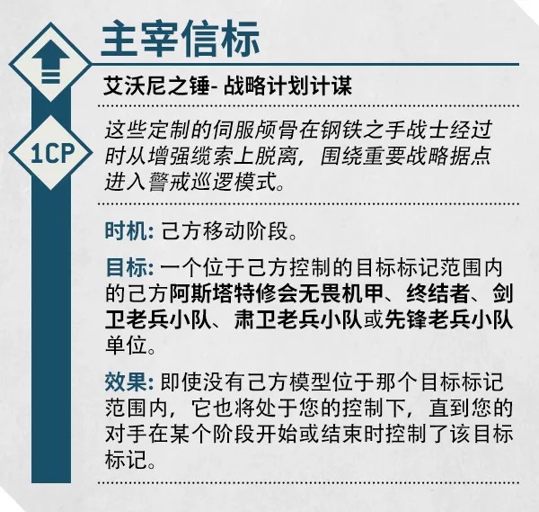 該戰團聞名的韌性通過鋼鐵之源強化得以彰顯,每回合可返還一名陣亡的護衛模型,而多項計謀如今同樣適用於無畏機甲以及終結者、劍衛老兵、肅衛老兵等經典老兵單位。主宰信標在重裝無畏的軍隊中尤為實用,它能將鎖定目標能力延伸至這些鐵甲步行者,使其在把敵人趕出關鍵點後仍能繼續穩固佔領。
