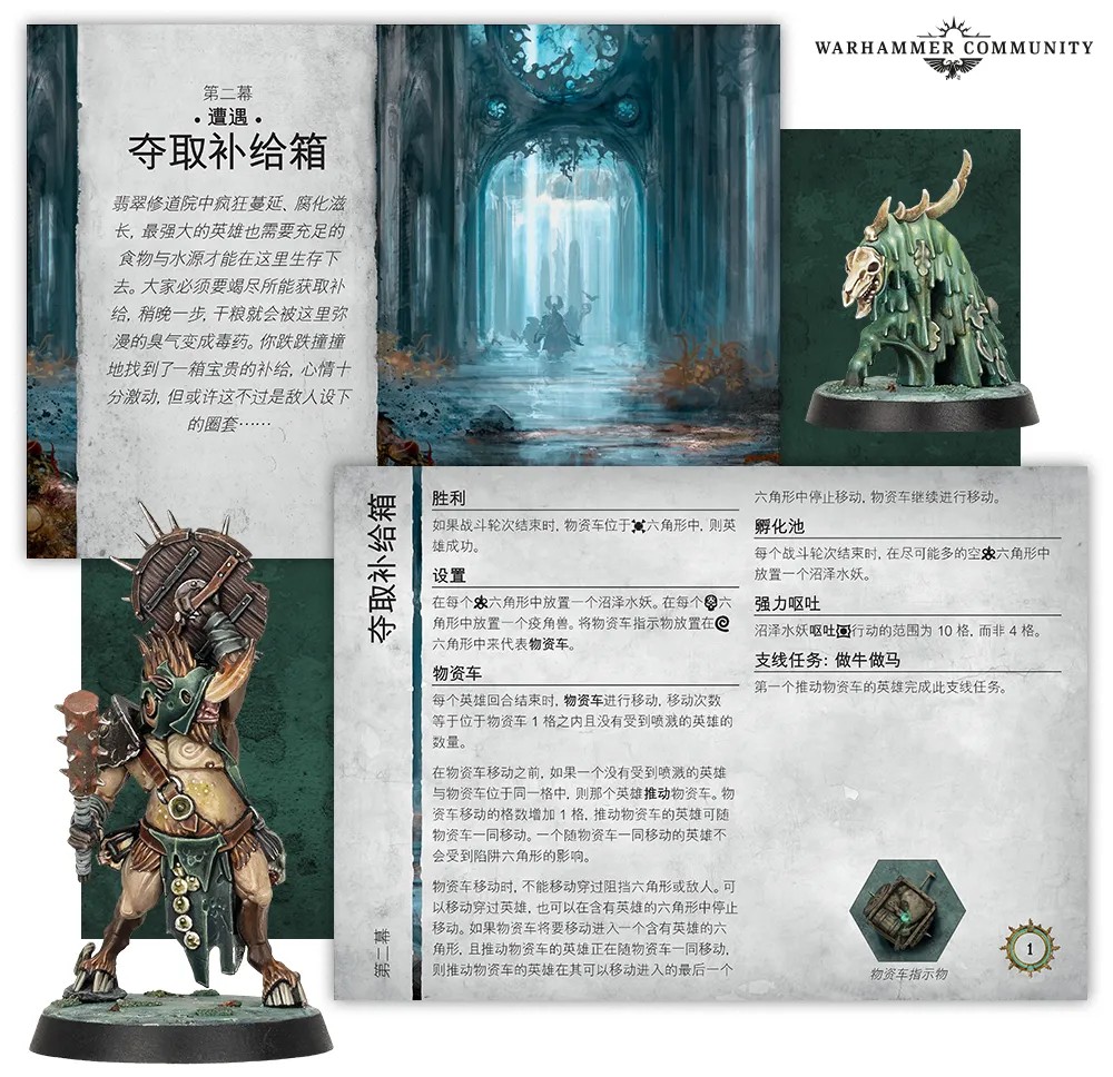 每張地圖都能支援多張遭遇卡片,這些卡片會改變戰鬥的走向。第二幕任務奪取補給箱與掃清魔穴使用同一張地圖,但加入了疫角獸,強化了沼澤水妖,並要求你推著物資車穿過令人窒息的沼澤。這將需要使用完全不同的戰術來征服,而且你可能還會配備不同的裝備。