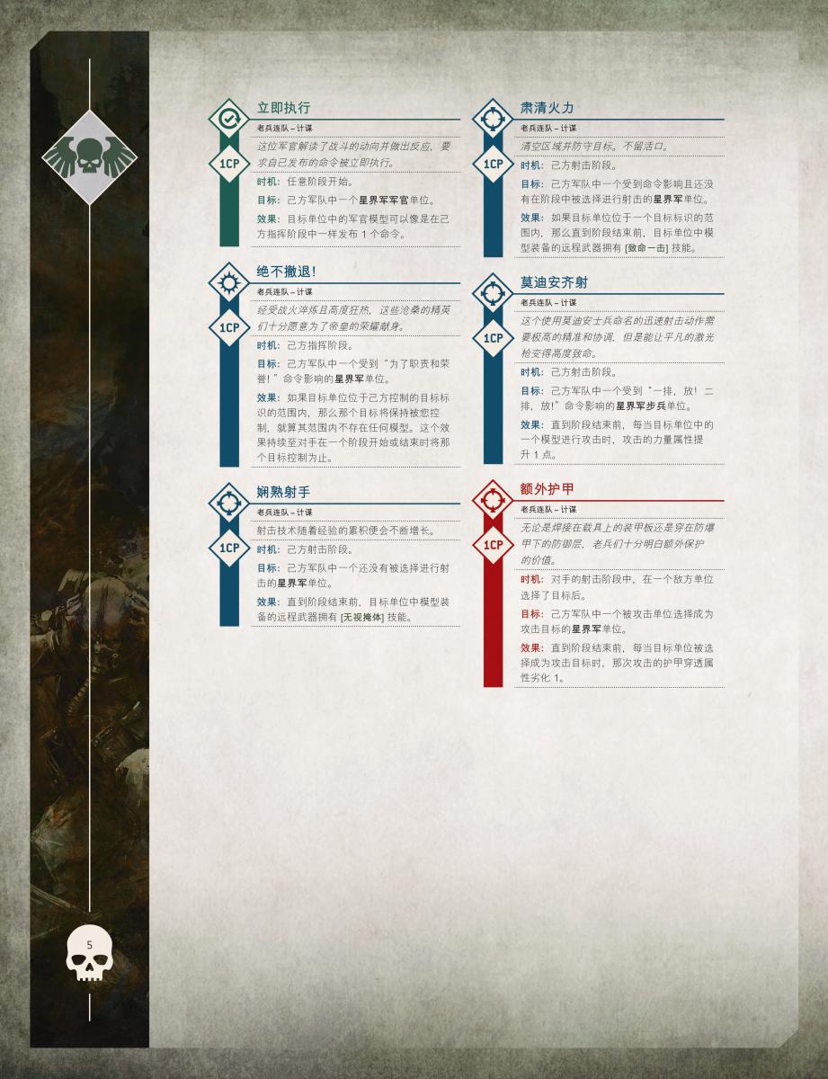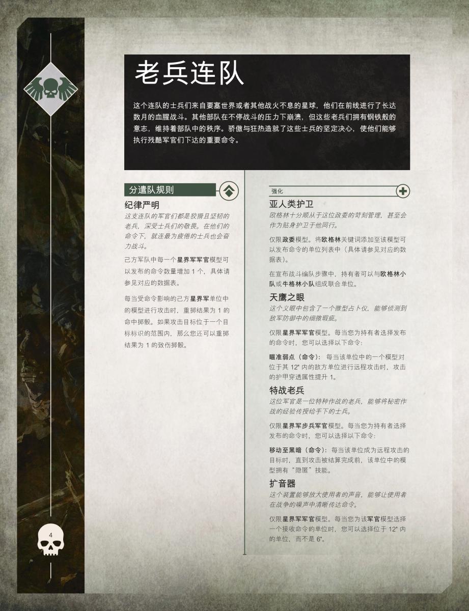這支分遣隊專指那些長期被部署在激戰最前線的星界軍部隊,他們久經沙場,已淬煉成憑藉英勇與紀律存活下來的老兵。麾下經驗豐富的軍官可下達額外的命令,受命令影響的星界軍單位,對所有目標可重擲結果為1的命中擲骰,或對位於目標標識範圍內的攻擊目標重擲結果為1的命中與致傷擲骰。