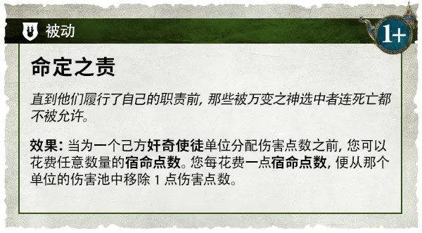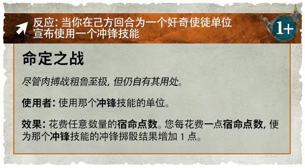這種虛幻的點數可以用於幾種技能,比如命定之責,讓你在將傷害點數分配給你的單位之前,將其從傷害池中移除。另一種為命定之戰,可以讓你的衝鋒擲骰結果增加1點,而命定之法則能強化你的施法擲骰。每種技能都可以通過消耗額外的宿命點數來增強效果,所以你可以自由選擇,可以慷慨解囊微調命運,或是累積資源給命運來一次強力推動。