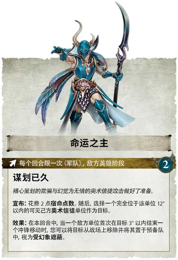 在這幅由閃爍幻象與流轉命運編織的錦緞中,命運之主登場了。他們在戰鬥中頗為實用,擁有4下撕裂屬性為2、傷害屬性為2的攻擊,同時也是一位戰略大師,通過奧術教派推進奸奇的宏圖。他們的計謀往往謀劃已久,執行時需花費2點宿命點數,隨著早已轉動起來的齒輪咬合,命運之主可指定附近的一名奧術信徒,在敵軍單位向其衝鋒時,將其瞬間轉移至預備隊中。