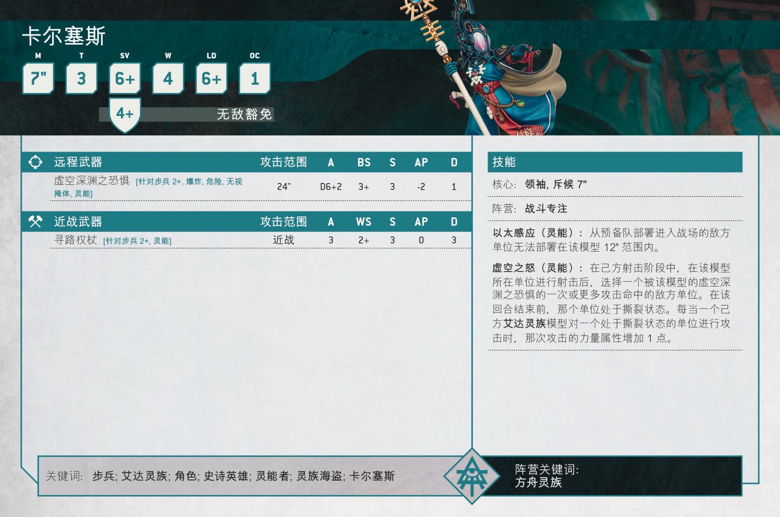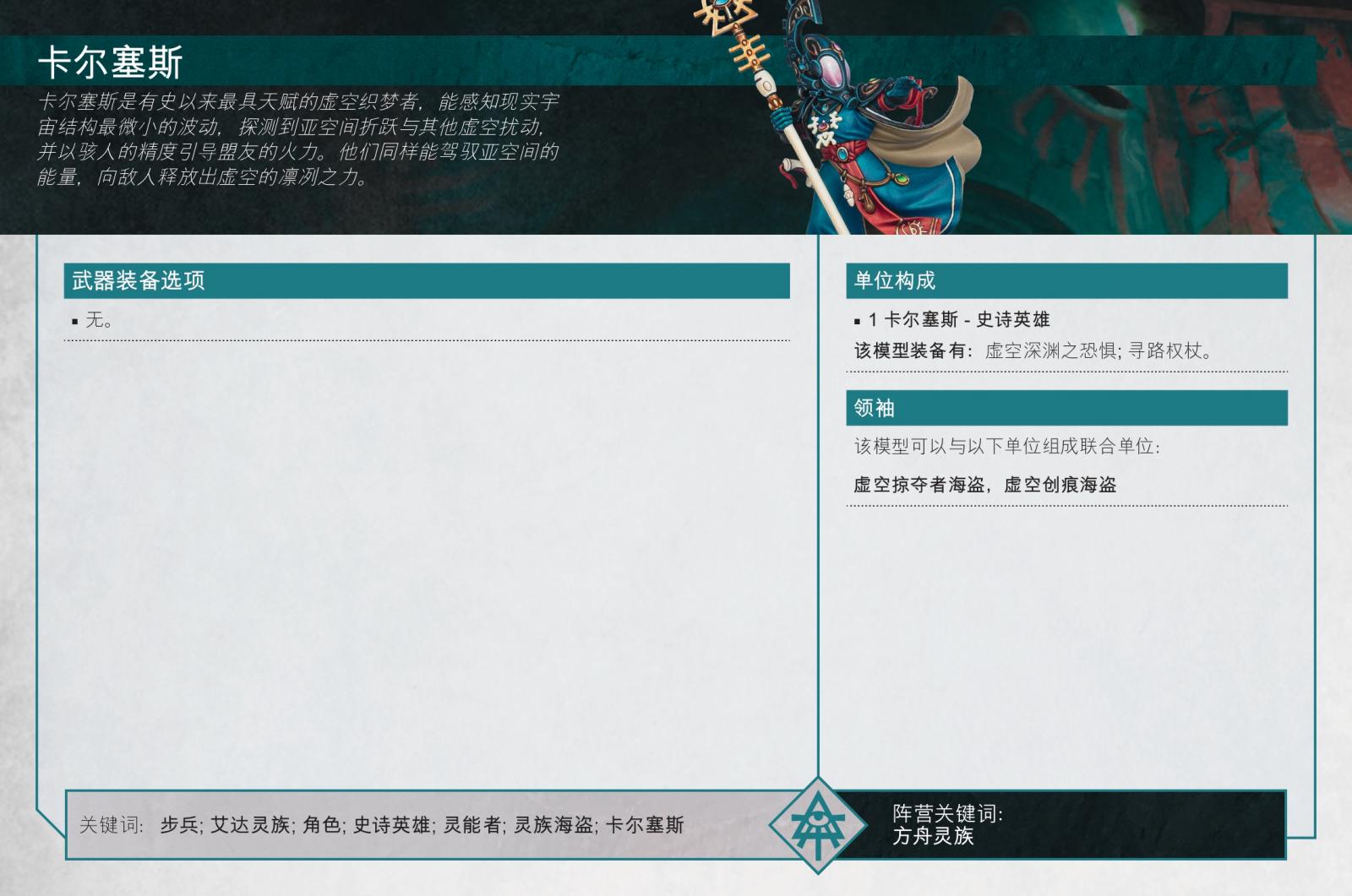 這次與他同行的是虛空織夢者卡爾塞斯,一位強大的靈能者,負責讓駭人劫掠者保持正確航向。他們能感知並回應現實空間中微小的擾動,當敵方投放部隊逼近時,這種能力極為寶貴,同時,他們獨特的靈能能力能夠擾亂現實結構,讓受影響的敵軍單位暴露於後續攻擊之下。