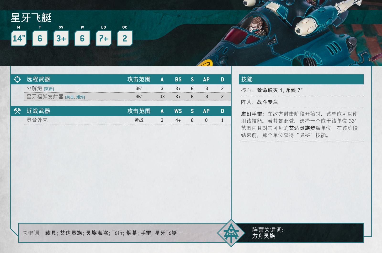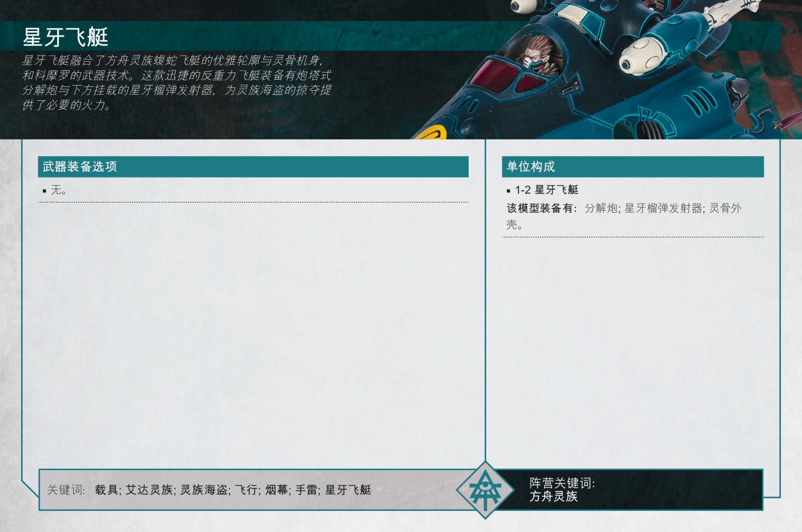 最後星牙飛艇利用其速度與兇狠的黑暗靈族武裝,在戰場上迅捷穿梭,以高威力的分解炮爆發與榴彈狂潮消滅敵方菁英步兵。星牙飛艇的榴彈發射器甚至能兼任防禦輔助武器,因為它可發射虛幻手雷,從戰場另一端模糊敵方視線,掩護己方海盜。