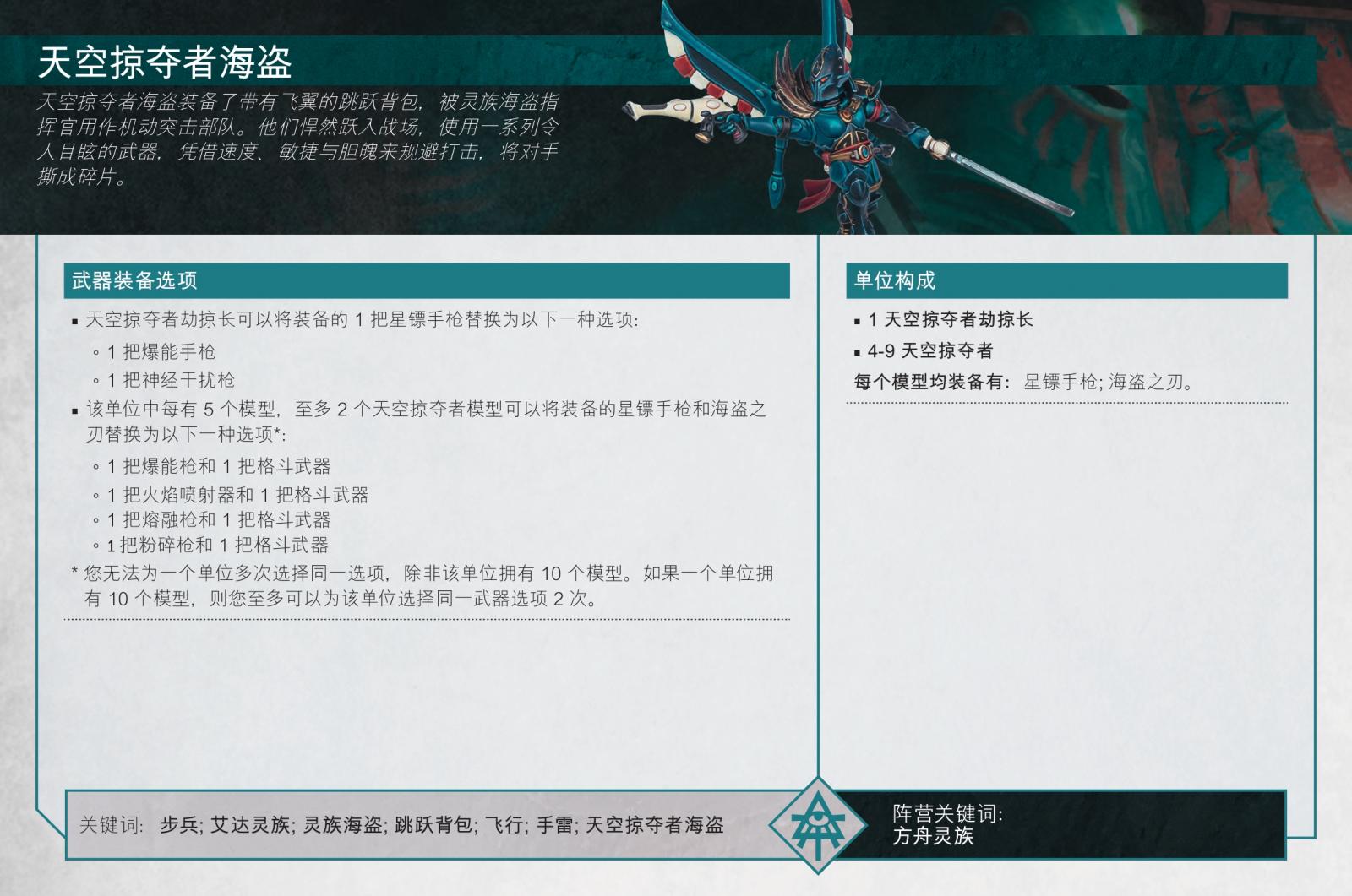 就第41千年的太空旅行危險來說,被艾達靈族海盜入侵並不是常見事件,但一旦發生,你可就真的大難臨頭了。他們獨特的打帶跑戰術將極速部隊與天才戰略結合在一起,其中許多戰術由史上最偉大的海盜艦長,駭人劫掠者的伊瑞爾親王所開創。