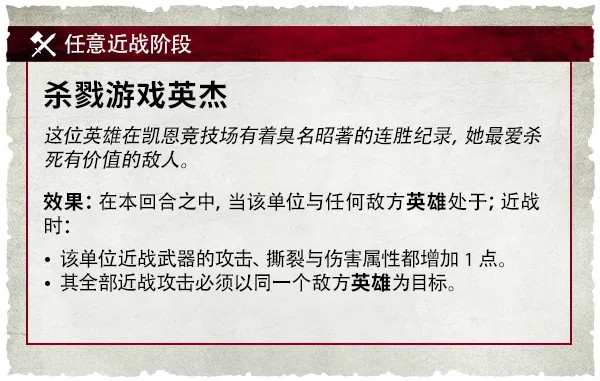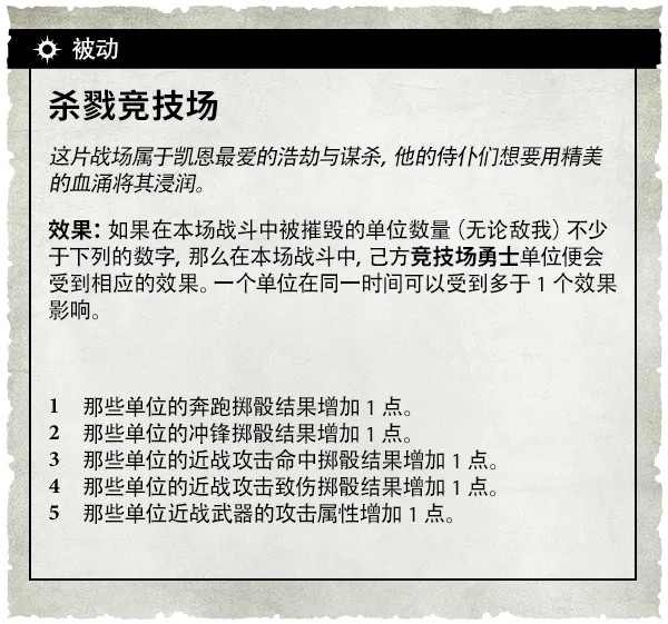 凱恩不問世事,唯血是求!*若你的軍隊在競技場中凱旋,你將獲得超強賦能,追獵殘敵至最後一刻,若敵人占得上風,你的倖存者亦將準備好進行光榮的最後一搏。若有英雄在競技場中落敗,甚至可借狂暴恢復浴血重生。