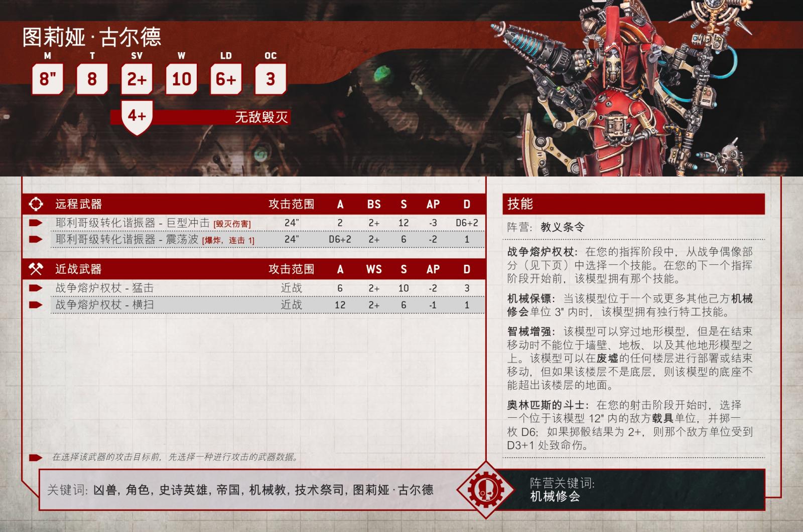 作為火星的終焉大賢者以及還原修會的老兵,圖莉婭.古爾德的一切都與一件事有關:毀滅。她高度增強的身體與傳奇的貝利薩留斯.考爾一樣耐用,而她的武器可以輕鬆地在極其強韌的異教徒身上打出洞來。