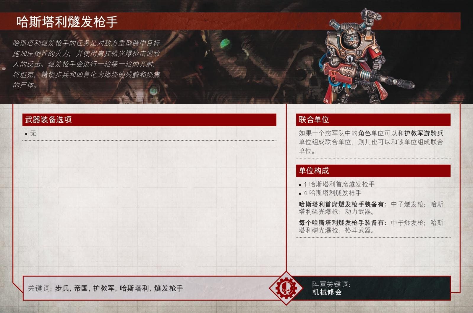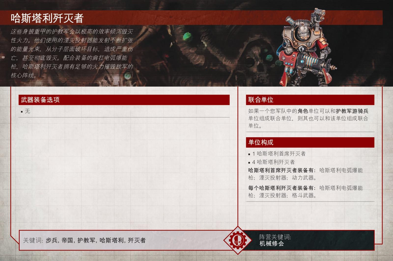 由古爾德帶領防禦鑄造世界阿格里皮納、裝備重型武器與裝甲的哈斯塔利,是護教軍軍團非常需要的火力支援單位,能夠在吸收回擊火力的同時在遠程造成大量傷害。他們可以作為兩種單位之一上場,殲擊者或燧發槍手,前者擅長清除步兵,而後者則專注於將載具和凶物炸成碎片。