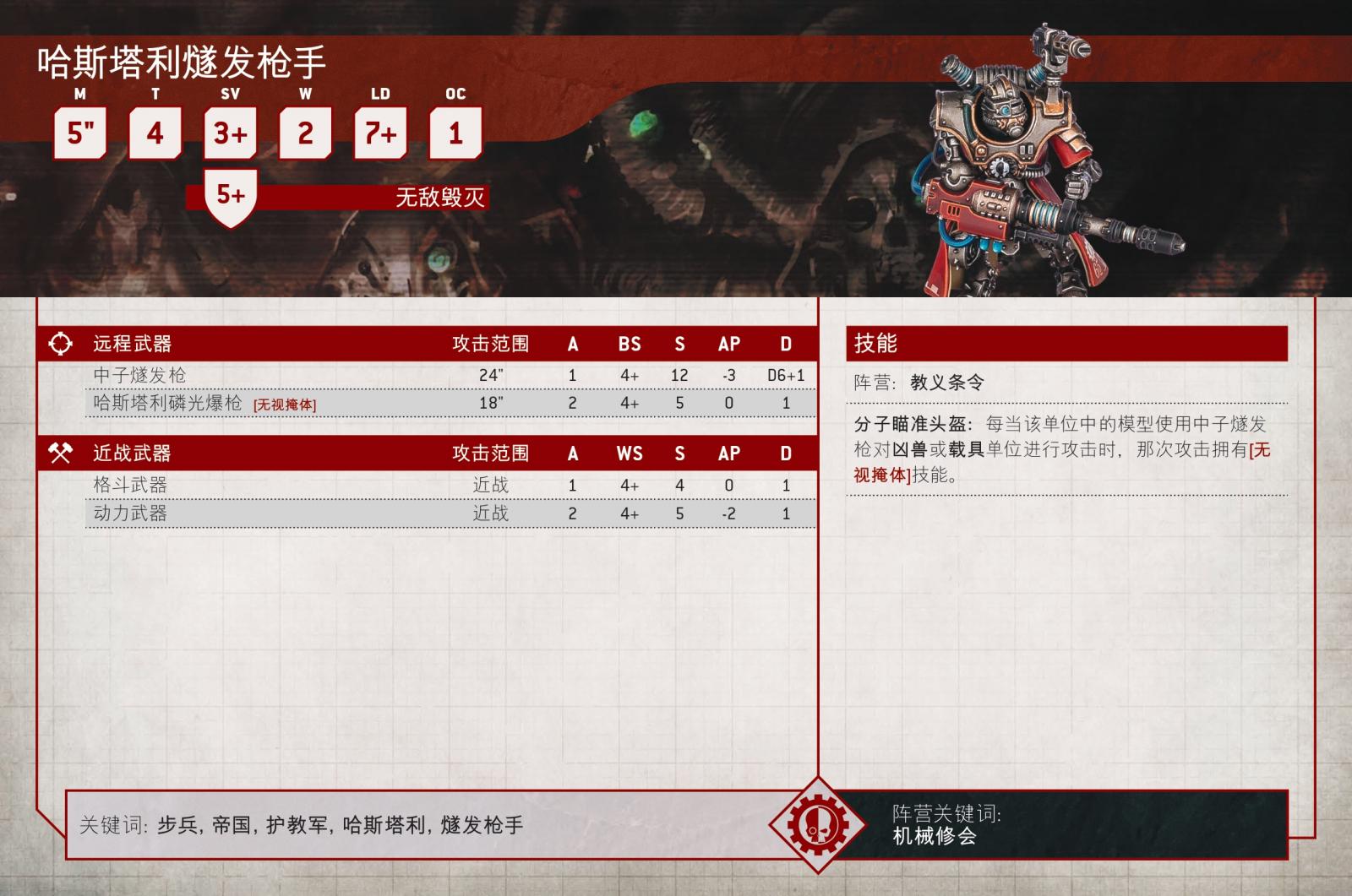 護甲豁免3+、無敵豁免5+以及2點耐傷的屬性值,使得這些生化槍手出奇地強韌,尤其是當他們躲在大型機械修會載具與難以移動的密集地形中時。他們還能在緊急情況下互相協助,因為殲擊者攜帶肩扛式電弧爆能槍,具有 【針對載具4+】,而燧發槍手則配備了能燒穿掩體的磷光爆槍。