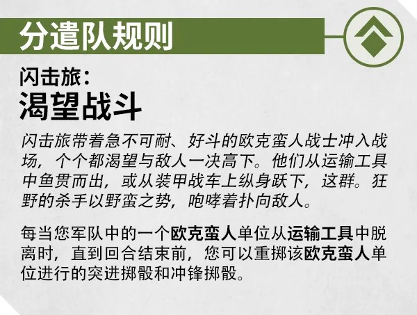 第二個分遣隊閃擊旅,同樣追求風馳電掣,但還想捎上成堆的小子一起上路。渴望戰鬥是一條極其寶貴的規則,能確保你脫離運輸載具的單位一路殺入近戰,而如果你將它與發動Waaagh!時的突進並衝鋒能力相結合,那麼在把砍刀插進敵人頭骨之前,你都會笑得合不攏嘴。