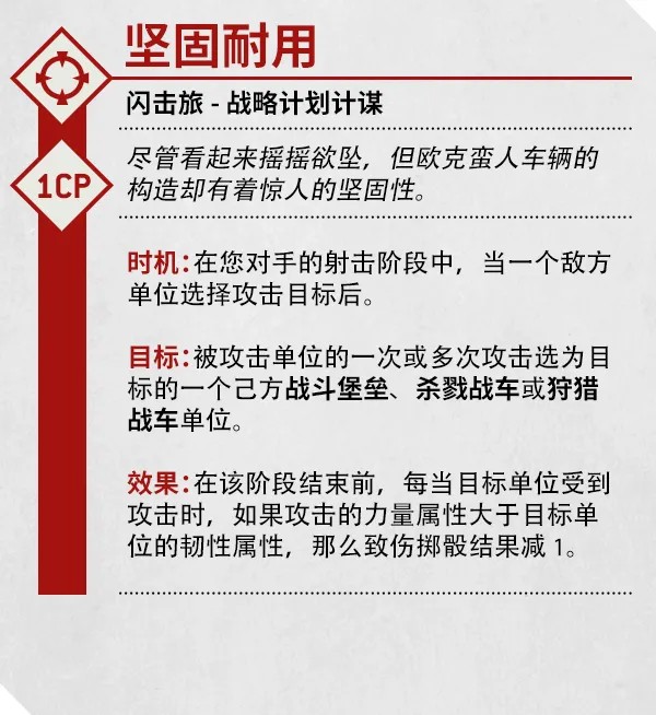 這確實意味著,為了讓運載的小子們有資格發起衝鋒,你必須將載具停在對手面前,扛過一回合的傷害。因此,這個分遣隊的數條計謀都圍繞著讓你的戰鬥堡壘、殺戮戰車和其他載具存活下來而設計。