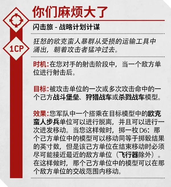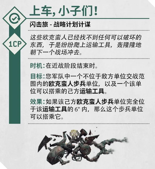 堅固耐用是一種經典手段,用來輕鬆扛下專職反坦克殺手的強力射擊,在技師特殊塗料的作用下,即便泰坦級武器對戰鬥堡壘的致傷也需擲出3+。不過迄今為止我們最喜歡的,而且絕對是最具歐克蠻人風格的,當數你們麻煩大了。從運輸載具裡蜂擁而出,就是為了和周圍的敵人打架,這對你普通的小子來說完全說得通,而如果你真的需要他們回到車裡,上車,小子們!只需花費1點指揮點數,就能把他們全部塞回戰車。