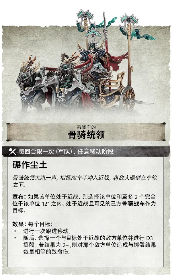 碾作塵土的命令使骨騎統領以及2個骨騎戰車能夠在移動階段進行一次跟進移動,同時還能造成致命傷。骨騎戰車本身設計用於執行掃蕩突擊,在向敵軍單位發起衝鋒時造成傷害,同時還能衝破防線(表現為移除模型並重新佈置進入近戰)。他們還能用標槍發動震懾攻擊,這並非通過武器屬性體現,而是一項在擲骰結果為3+時觸發的技能,造成1點致命傷,並阻止目標單位在本回合剩餘時間內進行跟進移動。