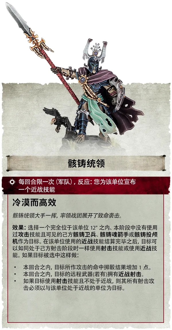 你的戰術拼圖中的最後一塊便是骸鑄領主。這些步兵軍官是目前部署的殮骨軍團中軍銜最低的,但卻同樣致命。憑藉冷漠而高效,他們可以命令另一支骸鑄單位在自己之後進行近戰,並使所有命中擲骰結果增加 1 點。這項技能允許骸鑄魂箭手和骸鑄投顱機選擇射擊代替近戰,並賦予其遠程武器近戰射擊規則*。如果被指定的射擊單位不處於近戰,則必須瞄準與骸鑄領主交戰的單位,以此實現遠距離復仇。