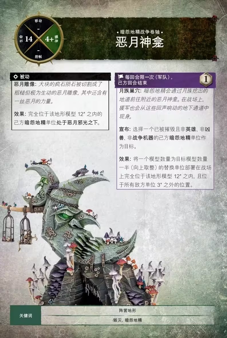惡月雕像會散發出12英吋的光環,賦予惡月的力量,由於它們通常位於月族巢穴的頂部,它們可以僅以一個指揮點數來補充被摧毀的單位。