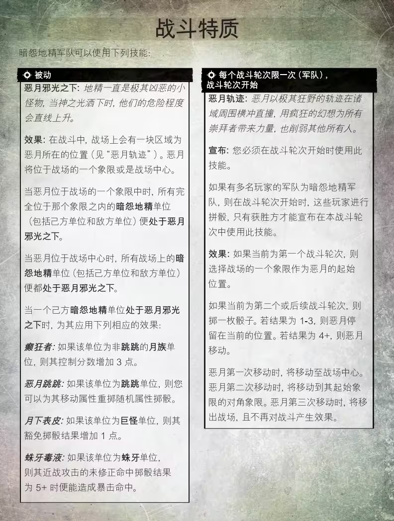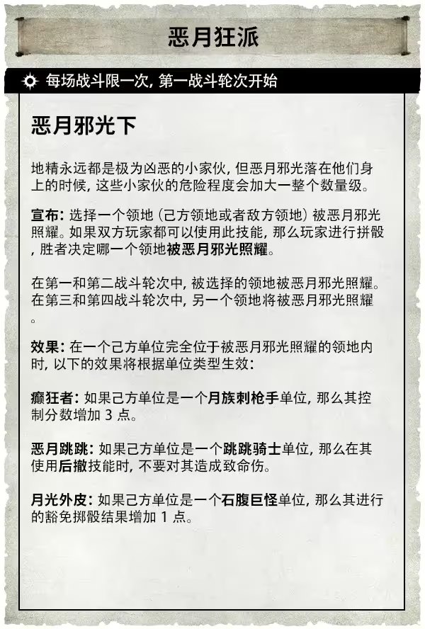 對於高度只能達到人類胸口的暗怨地精而言,《先鋒軍》是一款完美的遊戲。惡月狂派是一支包含著暗怨地精各種不同生物所組成的軍隊:狂月頭目領導著月族刺槍手、跳跳騎士以及石腹巨怪,在遊戲過程中,惡月邪光下的戰場會一分為二,而惡月狂派則會沐浴在邪光之下,進行戰鬥。