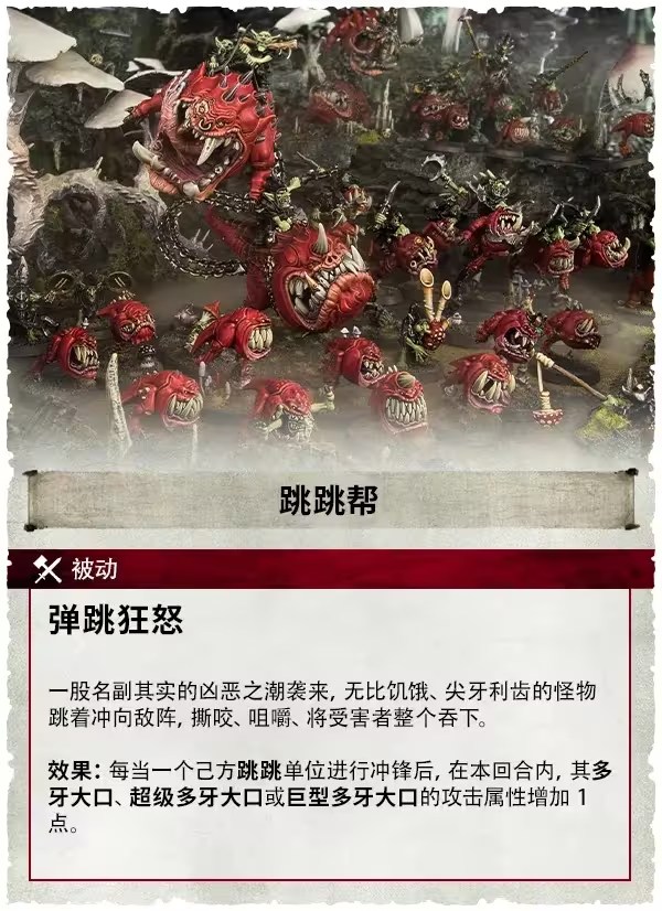 兩個具有10個月族刺槍手模型的單位都具有著重要的「增援」關鍵字,而那些兇猛且長著獠牙的跳跳騎士則會為你衝鋒陷陣。