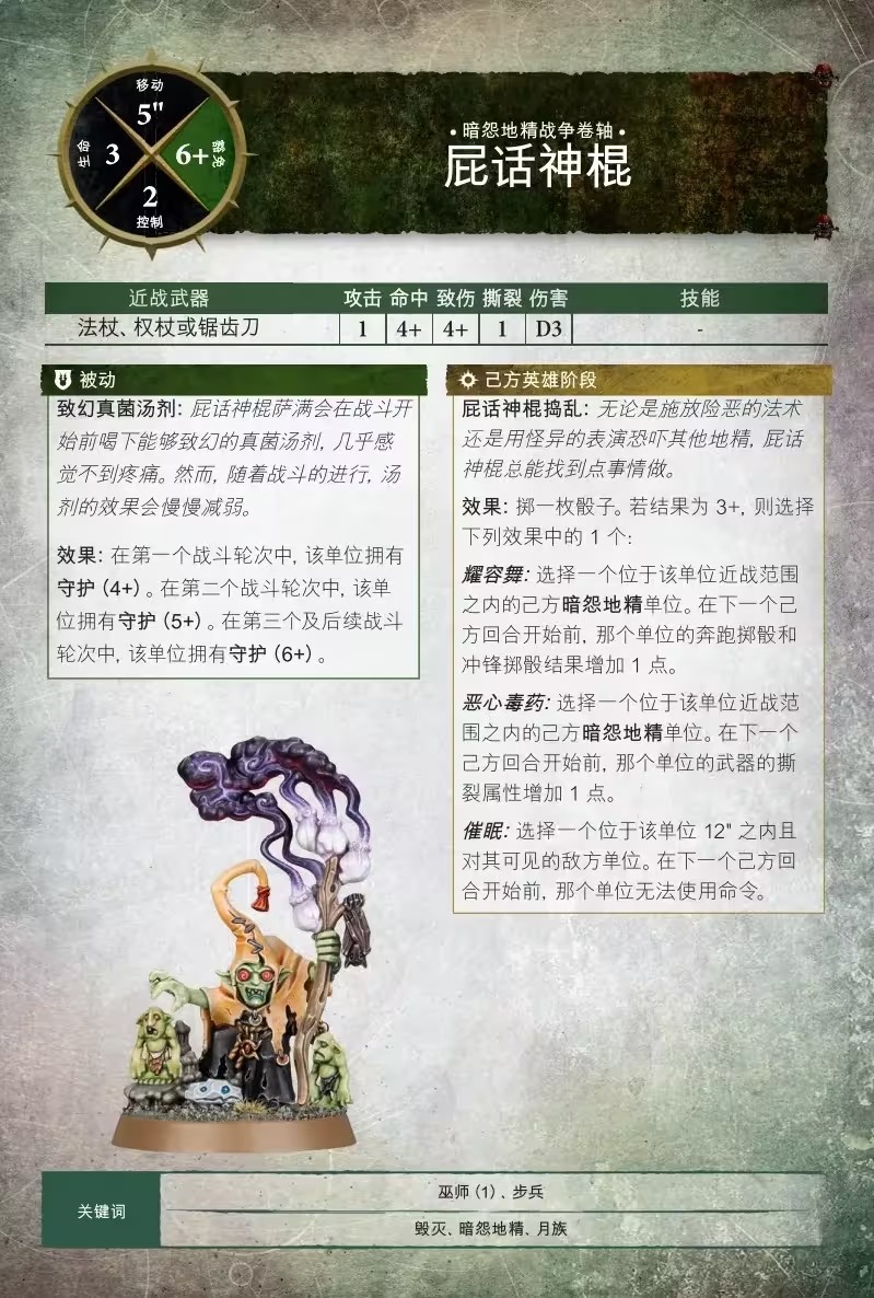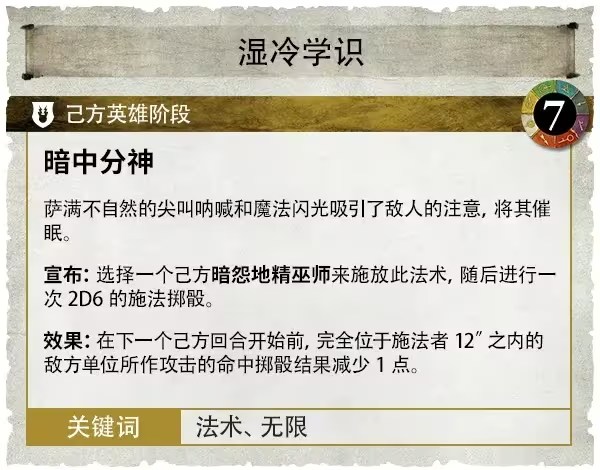 這種不自然的尖叫、呐喊和魔法閃光,會讓施法者12英吋之內的敵方單位的攻擊命中擲骰結果減少1點,對於這些穿戴著盔甲碎片和兜帽長袍,只有著5+或6+豁免屬性的小傢伙們而言,會非常有用。