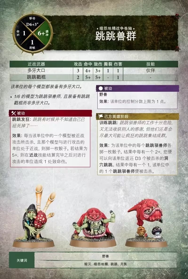 「那些長著獠牙快速向前跳躍的跳跳是你的攻擊性騎兵選擇,但卻不要指望它們能夠停留太久;如果你想利用地精天生狡猾的特性,你也可以結合一些巨蛛和蜘蛛騎兵來搞一些惡作劇。」