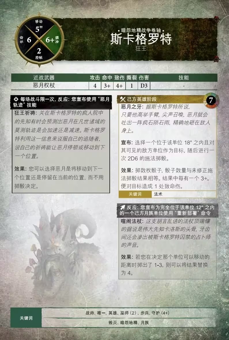 很少有地精能與狂王斯卡格羅特相提並論,之所以稱其為狂王,是因為他從一個特別生動的惡月夢中醒來後,發現自己戴著一頂真菌之冠,其根系直達大腦。