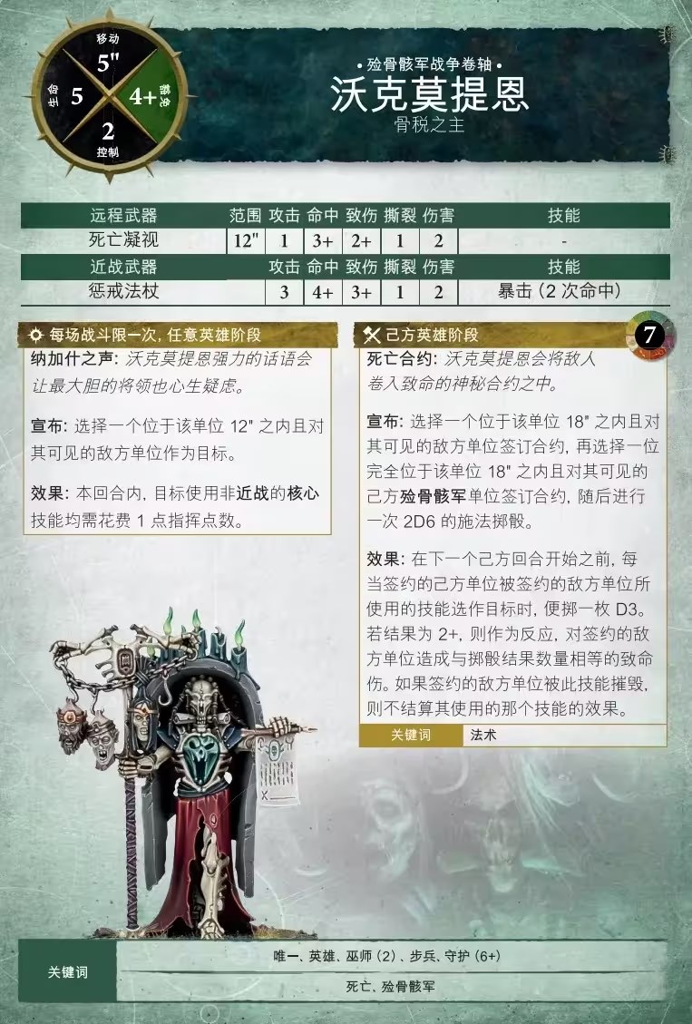 沃克莫提恩代表納加許之聲發言,在敵人隊伍中散播懷疑,敵方單位使用任何非近戰核心技能(如移動、撤退、射擊或衝鋒)時需要收取指揮點數。他可以用死亡合約進一步捆綁敵人,使他們每次以你的單位為目標時都受到致命傷。