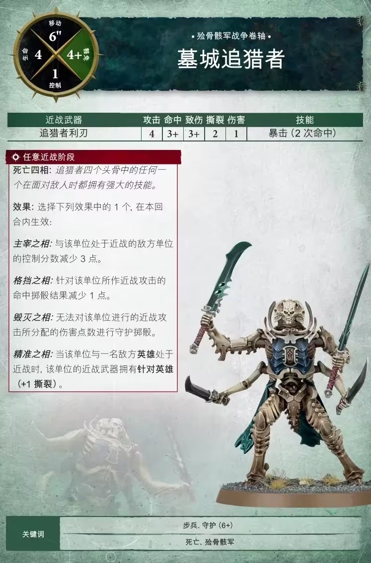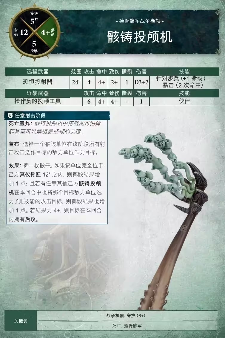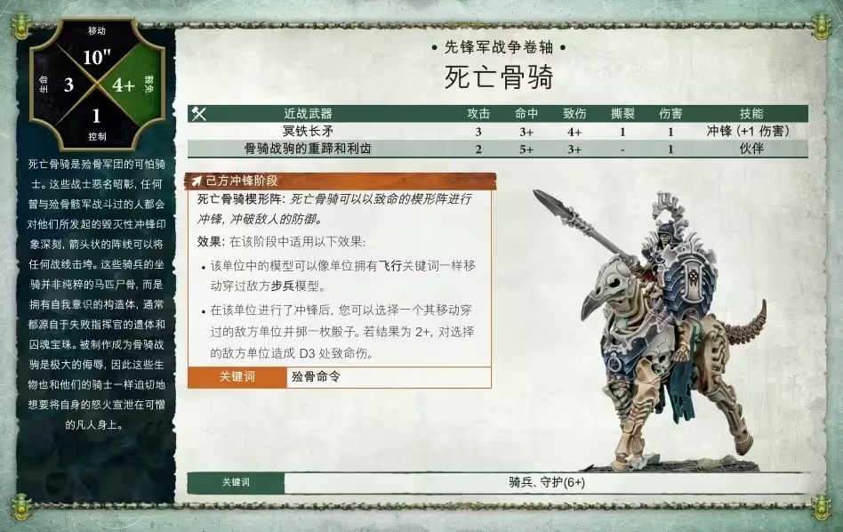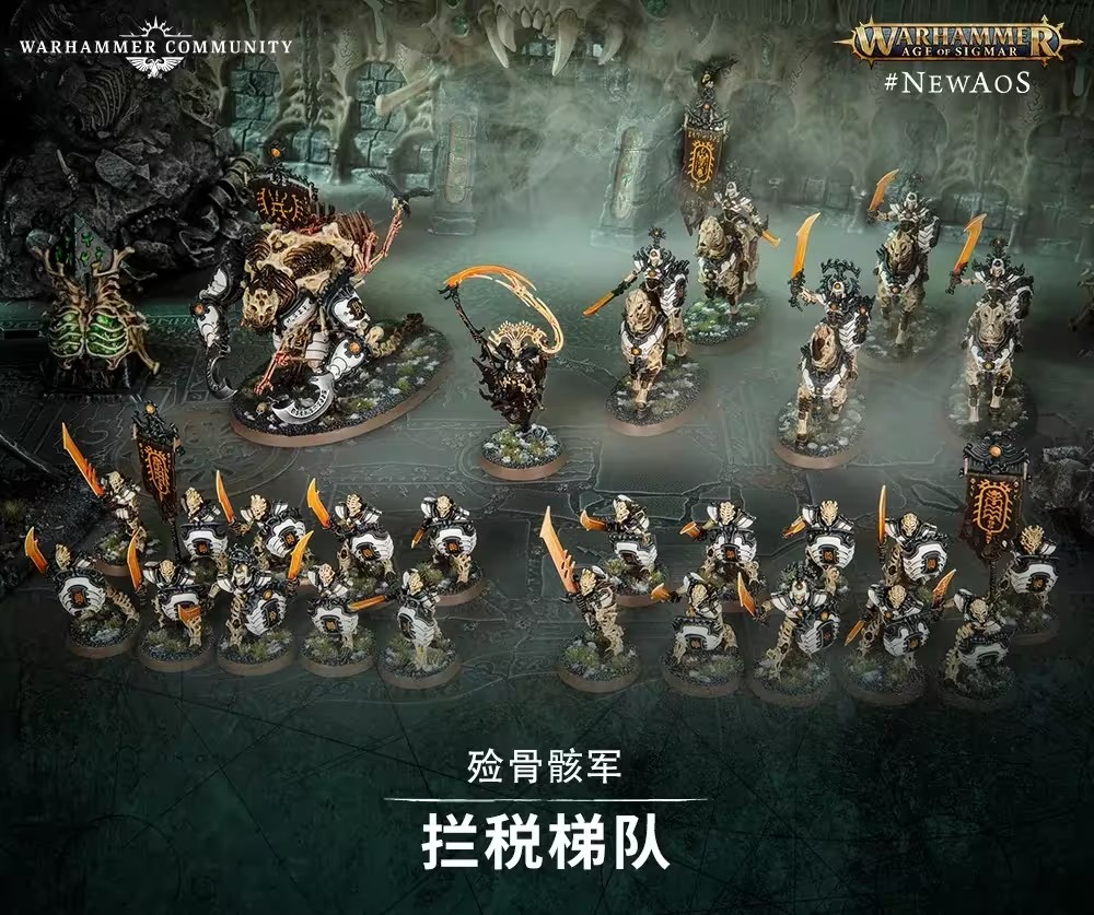 死亡骨騎在可怕的裝甲嵌骨戰馬上衝鋒,骸鑄投顱機向敵人投射亡靈炮火,而野蠻收骨者則是笨重的可憎之物,它們衝破敵人的防線,收集新鮮的骨頭。