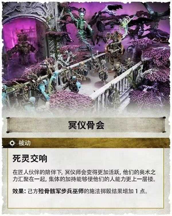 和其他陣營一樣,陣營包中有四種戰鬥編隊。製作殮骨骸軍的士兵和戰爭機器的冥儀骨會在合作時達到了新的高度,他們的《死靈交響》推動了鑄造工作。