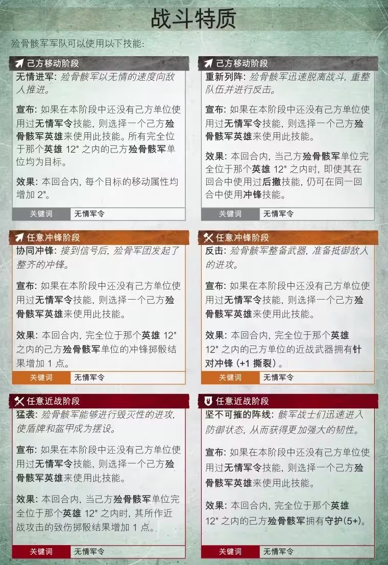 頑強的軍團遵循指揮官的命令,聽從無情軍令作戰。在每一個移動、衝鋒和近戰階段,殮骨骸軍都有兩種技能可供選擇,允許一名英雄指揮周圍的所有部隊。