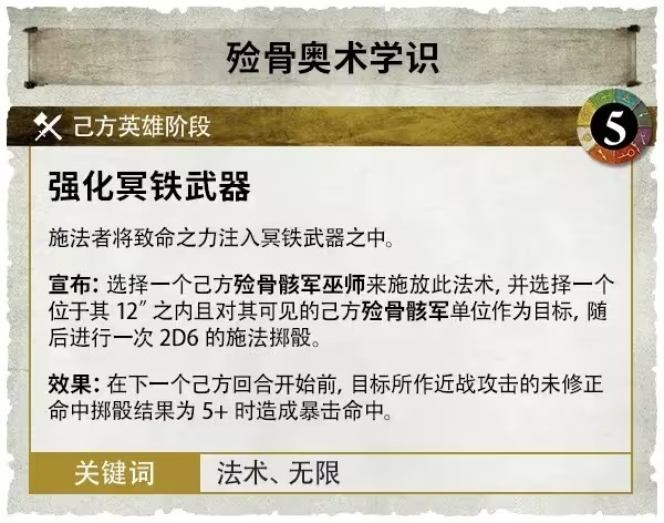 殮骨骸軍的武器充滿了可怕的煞伊許魔法,可以吞噬敵人的靈魂。當一個特別麻煩的敵人需要移除時,殮骨骸軍巫師可以使用他們的魔法賦予強化冥鐵武器力量,讓友軍單位在近戰中對5+的命中造成暴擊。